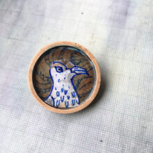 This is a handmade brooch with an original miniature artwork utilising the Decoupage technique to seal it.