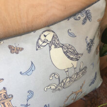This cushion cover is handmade featuring an original textiles design ‘Prairie and Puffin Willow’ by Catherina von Isenburg printed on linen cotton canvas with a blue herringbone tweed fabric back and hidden zip closure.