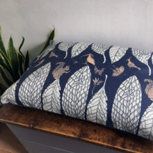 This cushion cover is handmade featuring an original textiles design ‘Wildlife Amidst the Leaves’ by Catherina von Isenburg printed on linen cotton canvas with a blue herringbone tweed fabric back and hidden zip closure.