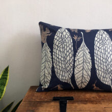 This cushion cover is handmade featuring an original textiles design ‘Wildlife Amidst the Leaves’ by Catherina von Isenburg printed on linen cotton canvas with a blue herringbone tweed fabric back and hidden zip closure.