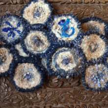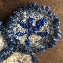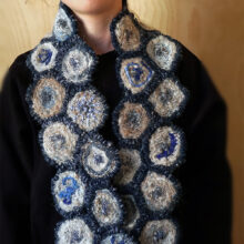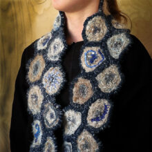 This is a hand spun, hand-woven and hand embroidered scarf by Catherina von Isenburg inspired by plant life. The embroidered patterns capture elements of endangered species of plants from around the world. As every plant is unique, so are these scarves. The natural colours of Staffordshire alpacas fleece comes across in the weaving. This is combined with wool from the Falkland Islands and finished off with Shetland lambs wool around the edges.